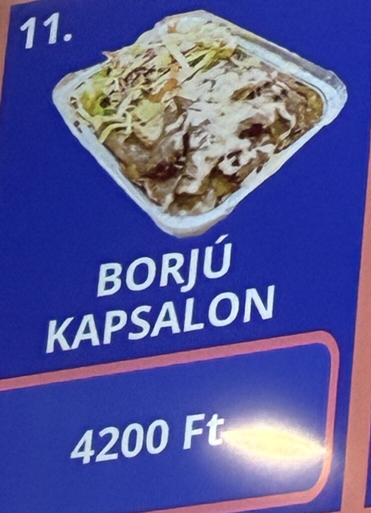 Twee warme maaltijden op een dag is wat te veel van het goede en daarom ging ik vanavond op zoek naar een lichte maaltijd. Met om de 500 meter een Grieks of Turks eettentje is dat niet zo moeilijk. Dat kebab/gyros kapsalon ook buiten Nederland bekend is hadden we in Zwitserland al eens ervaren. Het kwam als een verrassing dat ook in Hongarije “kapsalon” een begrip is. De eigenaar van het eettentje dat ik uitgezocht had wist zelfs dat het gerecht uit Nederland kwam. Ik heb hem uitgelegd wat een kapsalon is en hoe het gerecht aan zijn naam is gekomen. Ik heb het maar bij een gewone gyros gehouden.